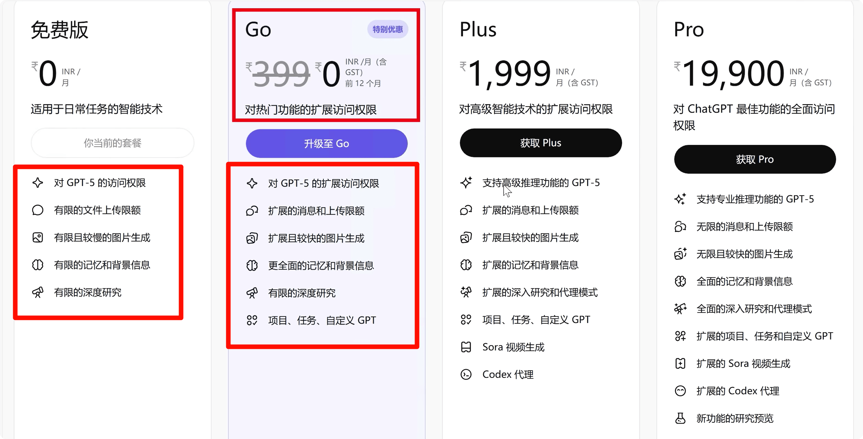 ChatGPT Go 是 OpenAI 于 2025 年 11 月 4 日在印度地区推出的全新套餐服务,据说使用额度限制是免费版的 10 倍左右,上下文窗口是免费版的 2 倍左右,官方套餐说明: